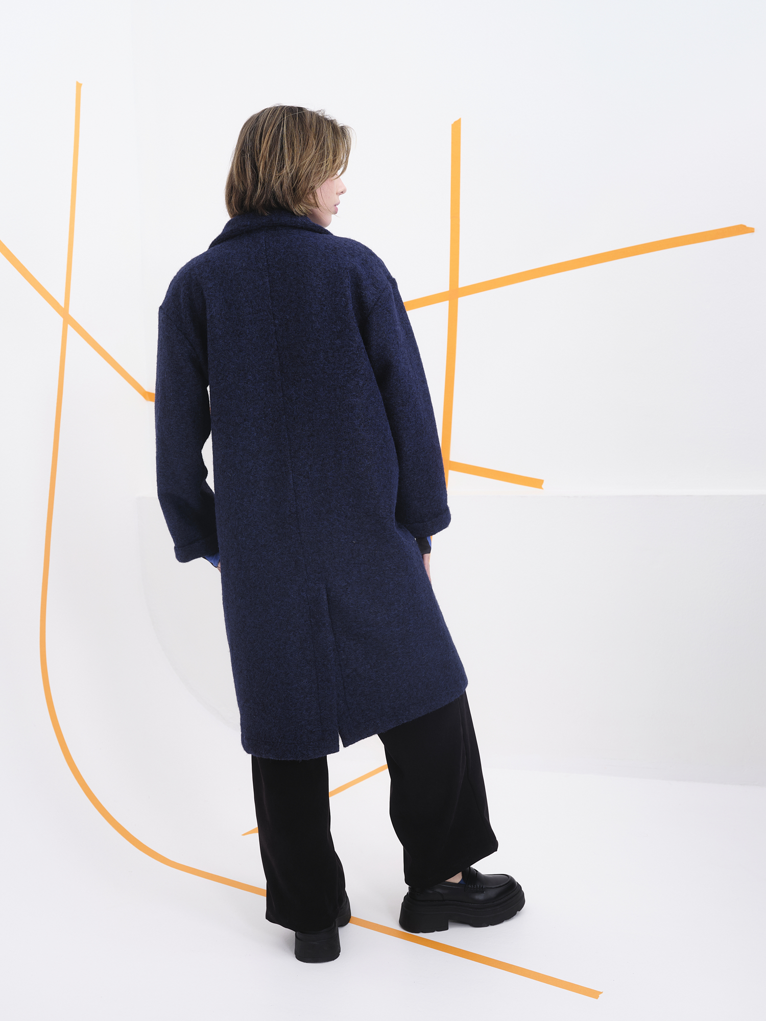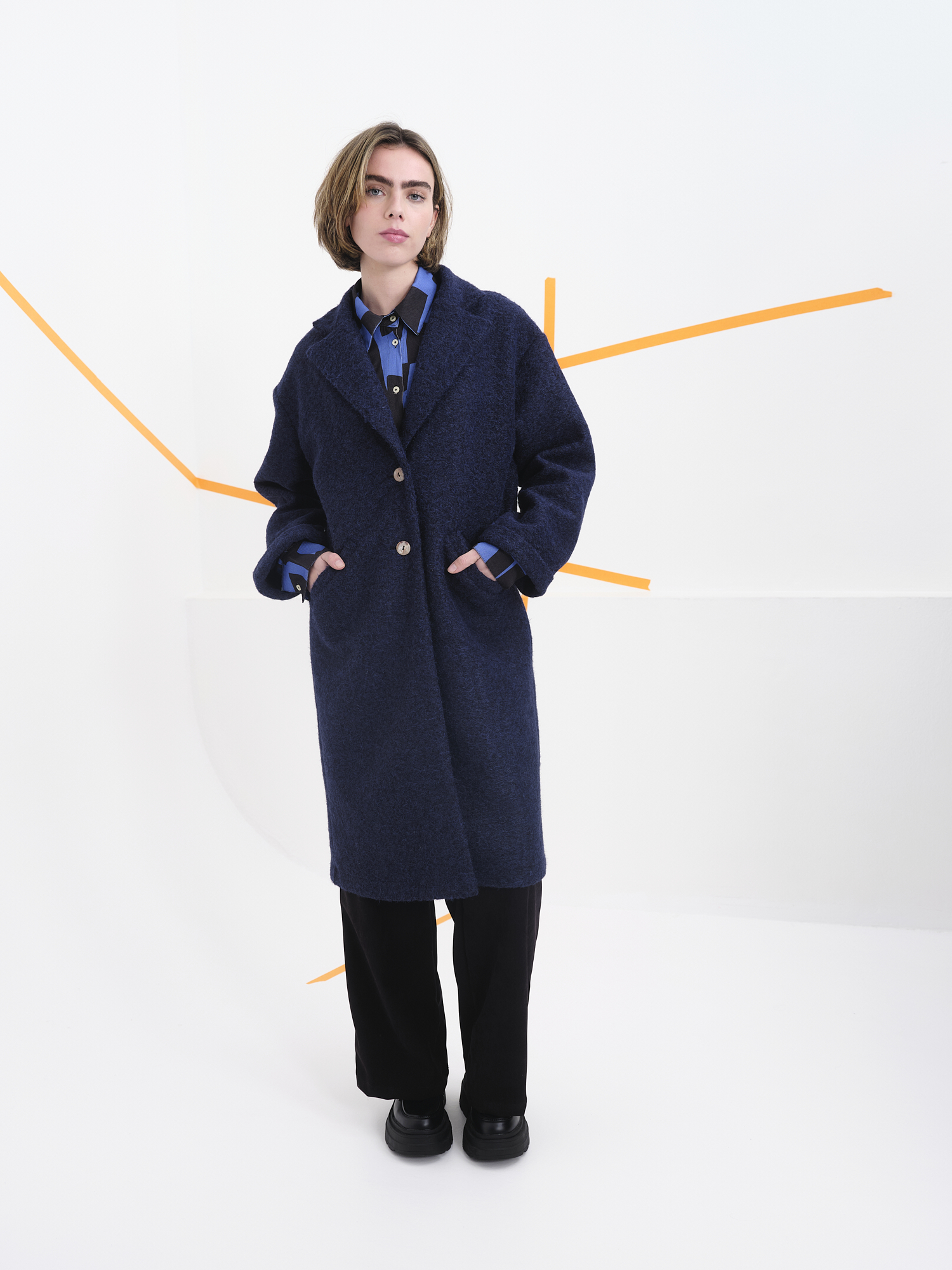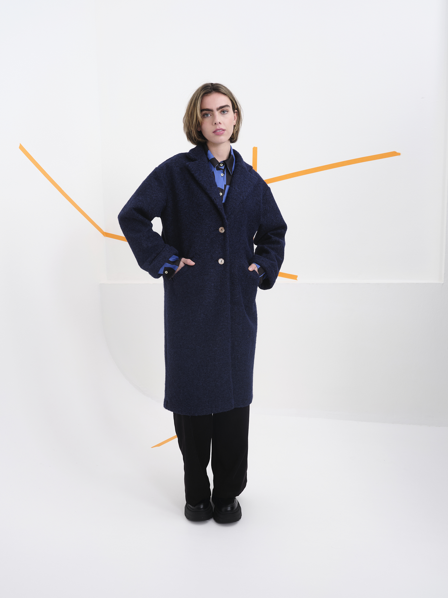 De largo elegante, por debajo de la rodilla, el Abrigo Cocteau Azul Marino estiliza la figura con su corte recto y equilibrado. Su cuello de solapa estructurado añade presencia y carácter, mientras que los puños vueltos aportan un toque clásico que refuerza su diseño sofisticado. Además, los bolsillos con solapa no solo añaden funcionalidad, sino que también completan la estética cuidada de la prenda, ofreciendo comodidad y practicidad para el día a día.