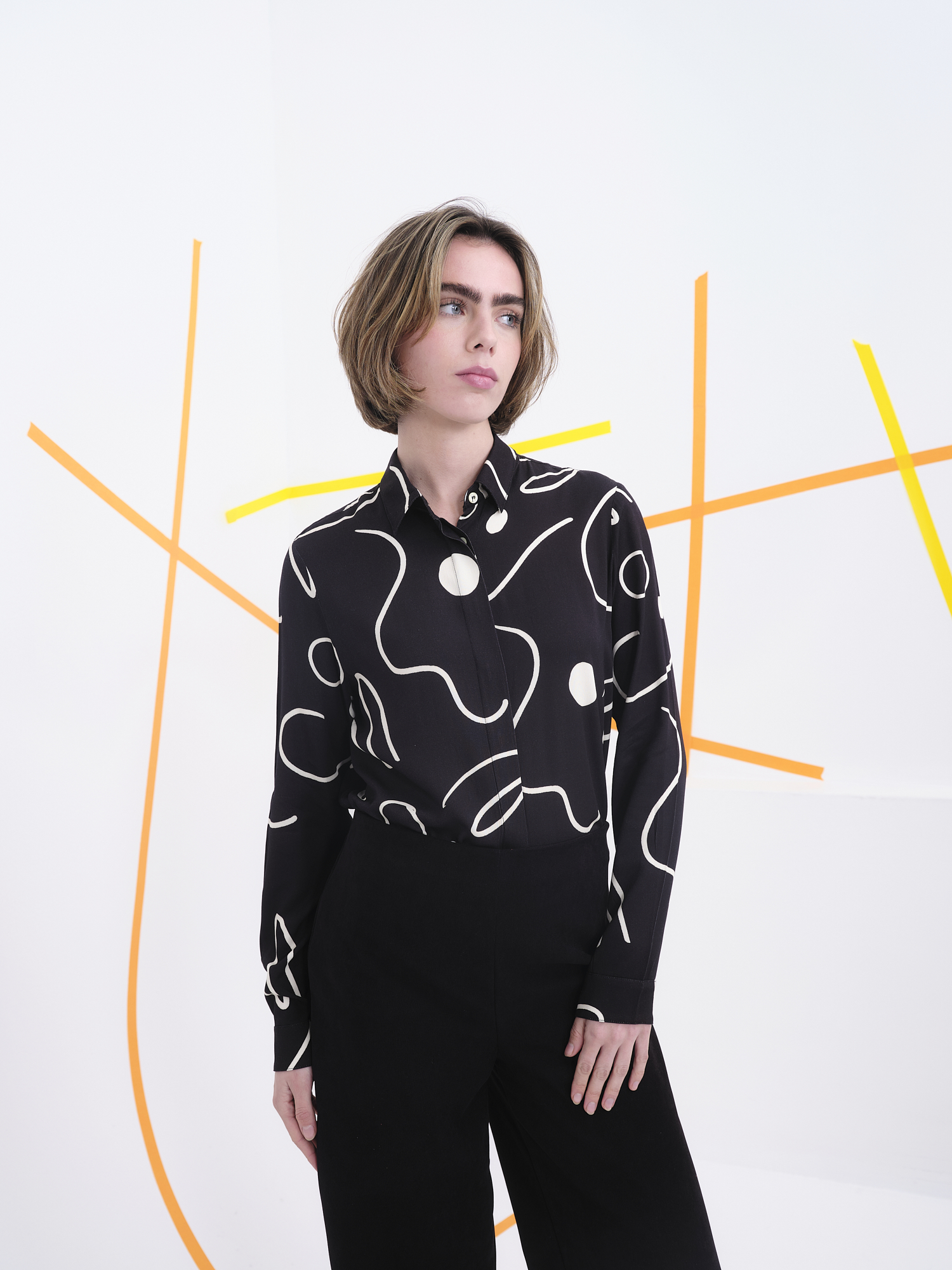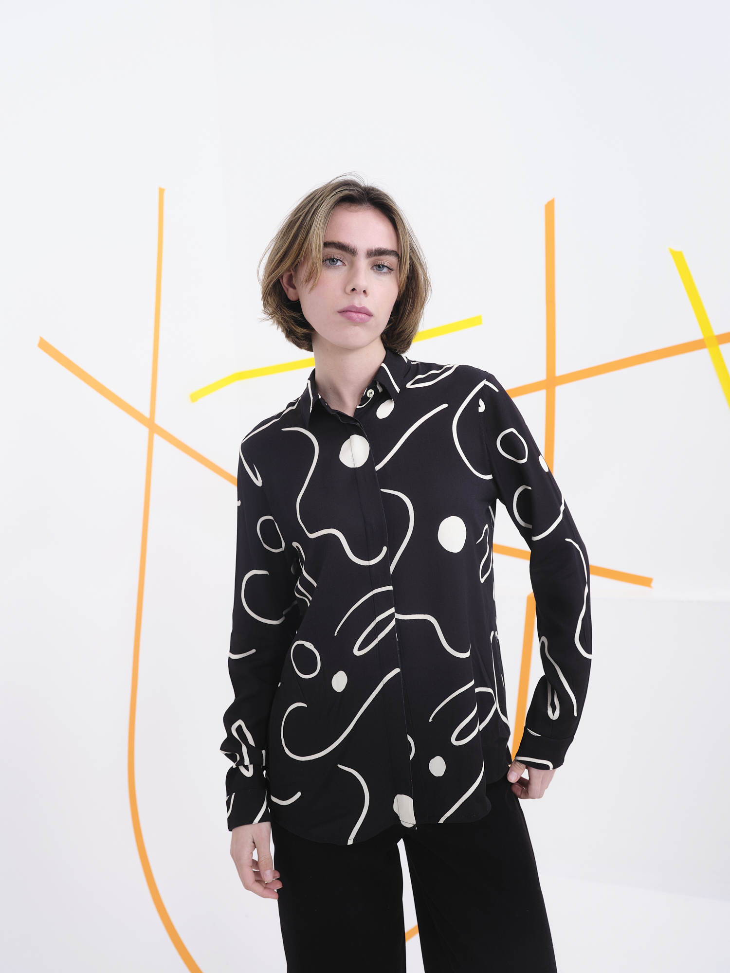 El equilibrio entre el arte y la funcionalidad es la esencia de esta prenda. Su cuello clásico y cierre de botones aportan un acabado pulido, mientras que el estampado lineal rompe con la rigidez tradicional, ofreciendo un toque de frescura y modernidad. Su ligereza y textura agradable al tacto hacen que sea ideal para llevar tanto en días cálidos como en entretiempo, combinando fácilmente con pantalones de lino, vaqueros o incluso debajo de una chaqueta estructurada.
