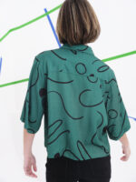 El contraste entre el fondo verde y las formas blancas genera una composición visual vibrante, que aporta dinamismo y personalidad a cualquier conjunto. Cada trazo del estampado parece moverse sobre el tejido, creando una sensación de fluidez que reinterpreta la camisa tradicional como una obra de arte textil. Su diseño versátil permite adaptarla a diferentes estilos, desde un look urbano y creativo hasta una combinación más sobria y sofisticada.