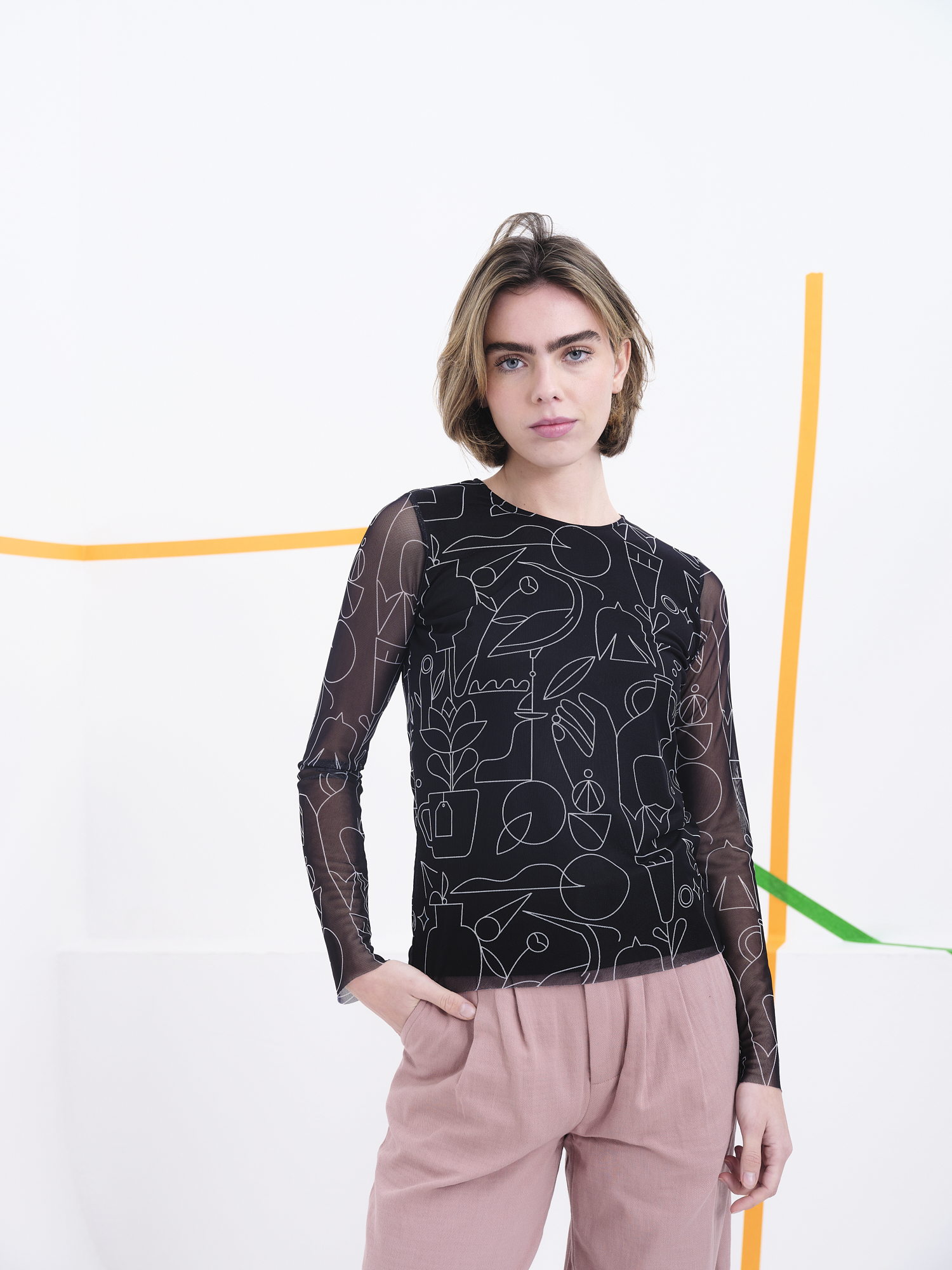 Esta camiseta de manga larga está confeccionada íntegramente en tul azul marino, creando una silueta ligera y envolvente. El cuerpo incluye forro interior para mayor comodidad y cobertura, mientras que las mangas permanecen completamente transparentes, dejando que el estampado se luzca sobre la piel. El diseño gráfico es obra de la ilustradora Judit Canela , aportando una dimensión artística y expresiva que convierte esta prenda en una pieza única. Perfecta para combinar con prendas neutras o como protagonista de un look creativo, esta camiseta fusiona lo etéreo con lo gráfico en una propuesta contemporánea y versátil.