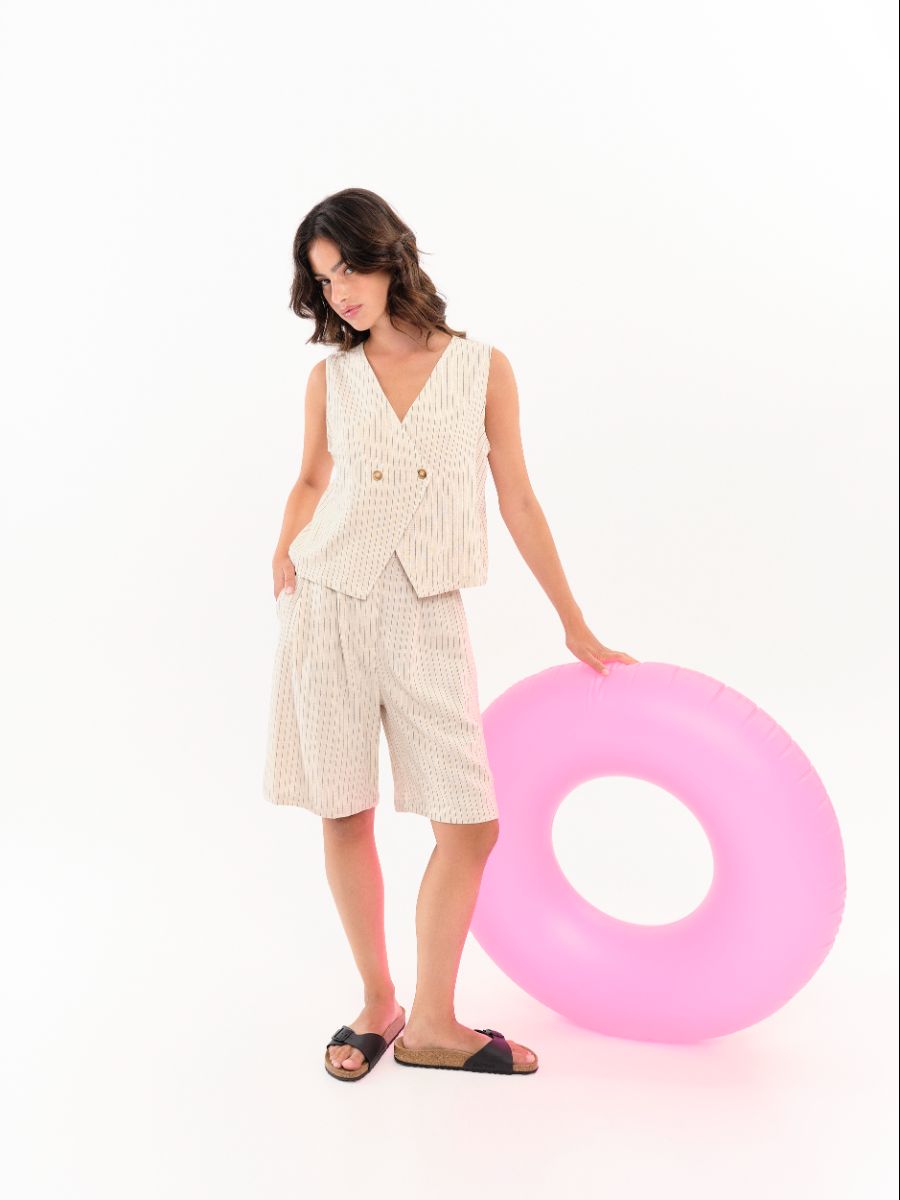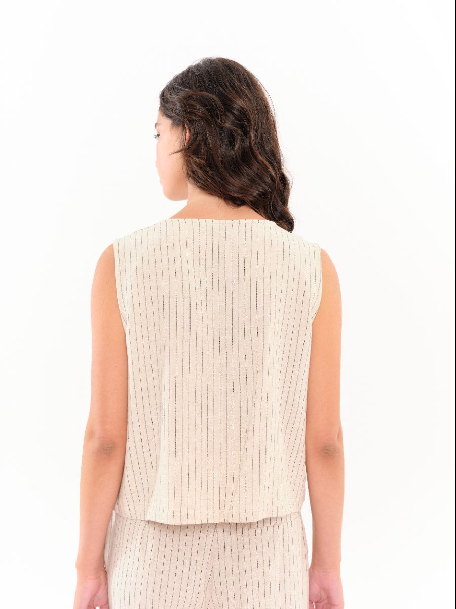 Chaleco de raya diplomática con escote en pico y cierre cruzado con botones. Perfecto para llevar solo o combinado. La modelo lleva la talla S.