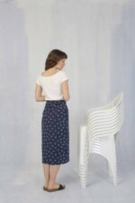 La modelo en la imagen lleva una talla S, mostrando cómo la Falda Bermudas Azul se adapta de manera favorecedora. Si buscas una prenda femenina, versátil y con un diseño sofisticado, esta falda es la opción ideal para tu armario.