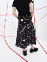 El estampado lineal con puntos es el elemento protagonista de esta falda. Inspirado en los trazos libres del arte manual, este diseño evoca una sensación de movimiento y equilibrio visual. Sobre el fondo negro, las líneas y formas orgánicas adquieren un contraste refinado y artístico, aportando profundidad y carácter al conjunto. Su estilo versátil permite adaptarla a distintos looks, desde los más casuales hasta los más elegantes, dependiendo de los complementos con los que se combine.