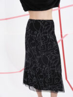 El diseño gráfico de la falda Tarantino Negro es obra de la ilustradora Judit Canela, cuyo trazo distintivo aporta profundidad y personalidad a la prenda. Sobre la superficie del tul se despliegan rostros, líneas orgánicas y formas expresivas que transforman la falda en una verdadera obra de arte textil. El efecto de transparencia del tejido resalta la superposición de capas y crea un juego de luces y sombras que realza el movimiento, aportando un toque etéreo y contemporáneo.