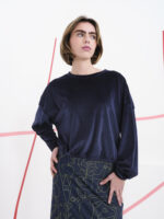 El jersey Sorrentino Azul Marino se distingue por su corte amplio y relajado, pensado para ofrecer comodidad y libertad de movimiento sin renunciar a una silueta elegante. La textura del terciopelo elástico añade riqueza visual y una sensación de suavidad que lo convierte en una prenda imprescindible en el guardarropa moderno. Su diseño limpio y versátil permite combinarlo con facilidad, funcionando tanto como base de un look minimalista como pieza clave dentro de un conjunto más expresivo.