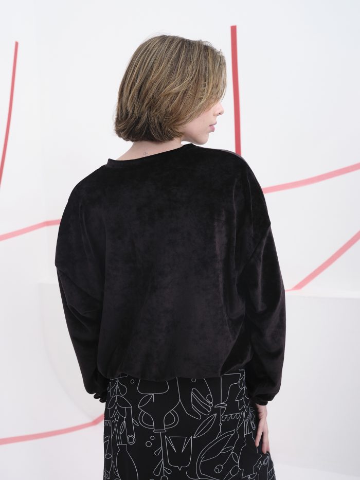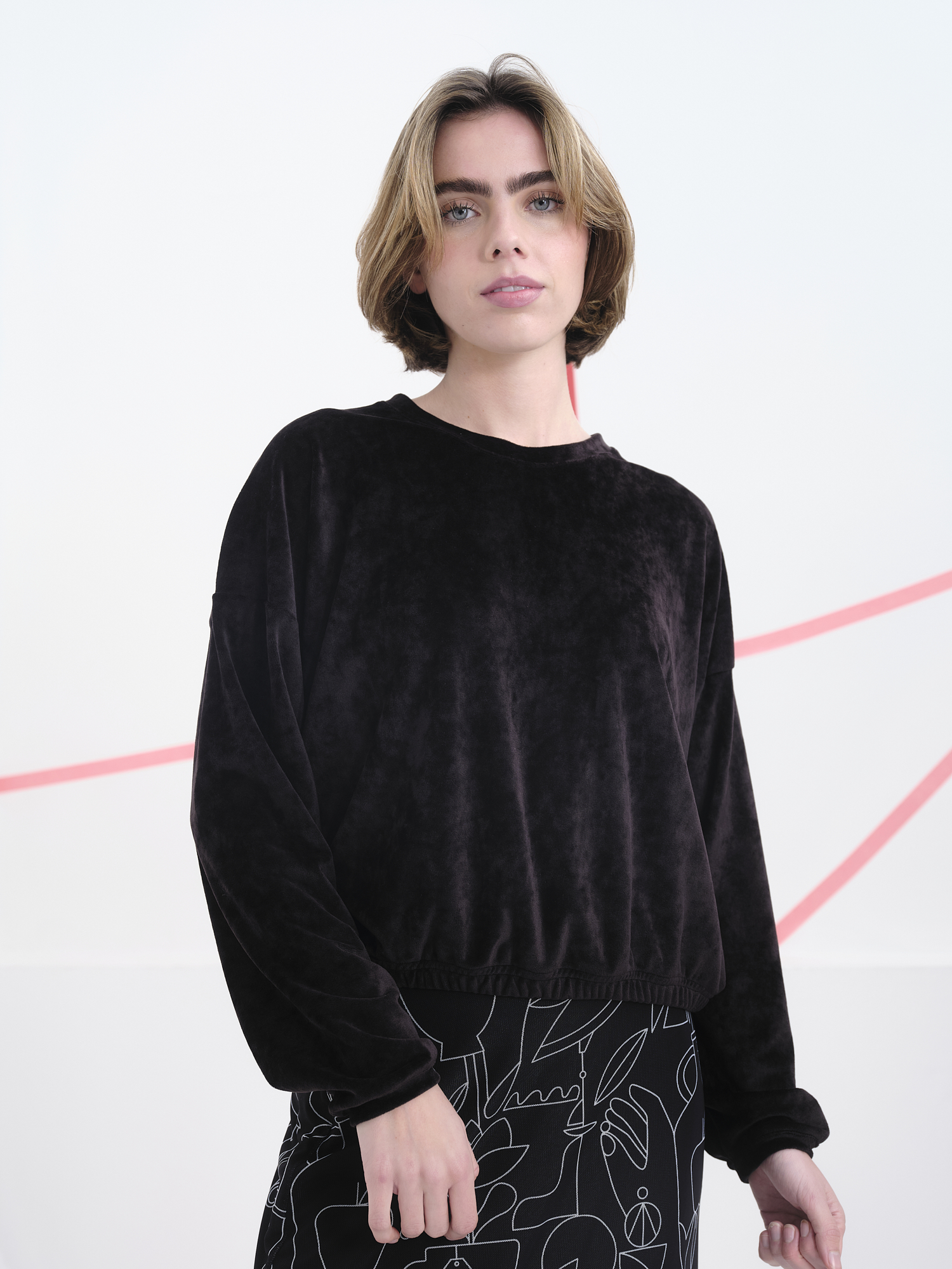 Este jersey tipo sudadera de manga larga está confeccionado en un suave terciopelo elástico que combina comodidad y sofisticación. Su textura aterciopelada aporta profundidad visual y un brillo sutil que reacciona con la luz, mientras que el corte amplio y relajado permite libertad de movimiento sin perder elegancia. La prenda tiene un estilo sobrio y versátil, ideal para looks tanto diurnos como nocturnos. Perfecto para combinar con estampados gráficos o prendas lisas, este jersey se convierte en una base rica y expresiva dentro de cualquier conjunto contemporáneo.