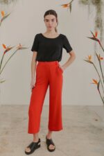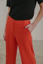 La modelo en la imagen lleva una talla S, mostrando cómo el Nalón Rojo Anaranjado se adapta de forma fluida y elegante. Si buscas un pantalón versátil, moderno y cómodo, esta es la elección ideal para tu armario.