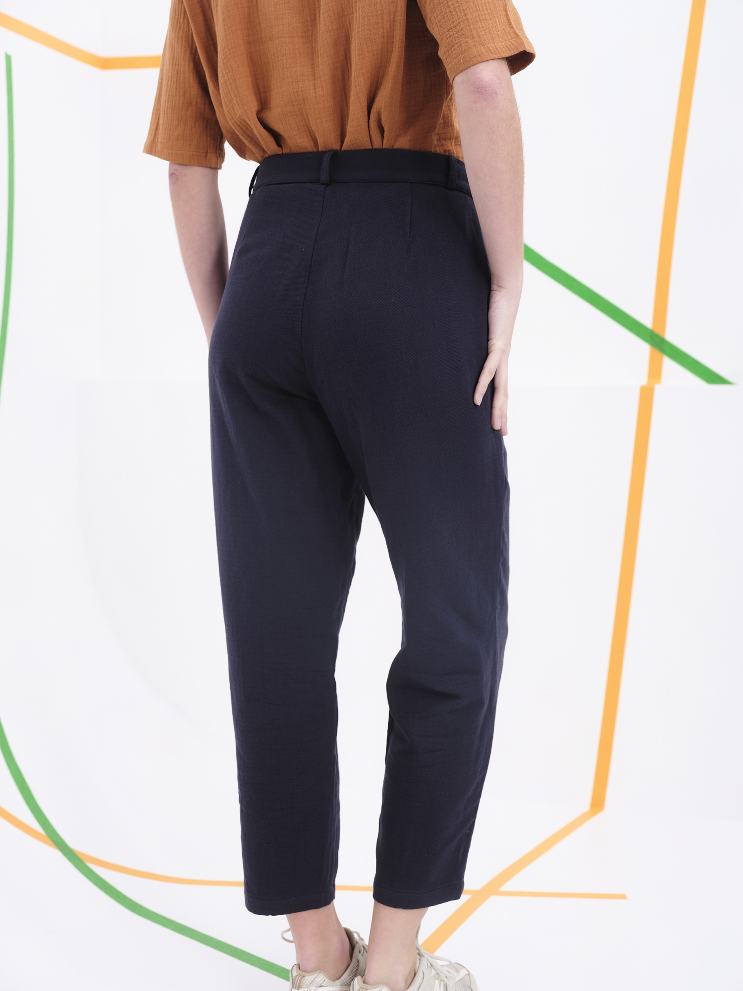 Este pantalón de corte fluido y tiro alto combina elegancia relajada con un aire contemporáneo. Confeccionado en una sarga de algodón muy suave, su diseño presenta pliegues sutiles que aportan textura y movimiento, creando una silueta estilizada sin perder comodidad. El tejido ligero y vaporoso lo convierte en una opción ideal para climas cálidos o looks de entretiempo.Perfecto para combinar con blusas estructuradas o camisetas básicas, este pantalón se adapta tanto a estilismos casuales como a propuestas más sofisticadas. El resultado: una prenda versátil que transmite frescura, creatividad y personalidad.