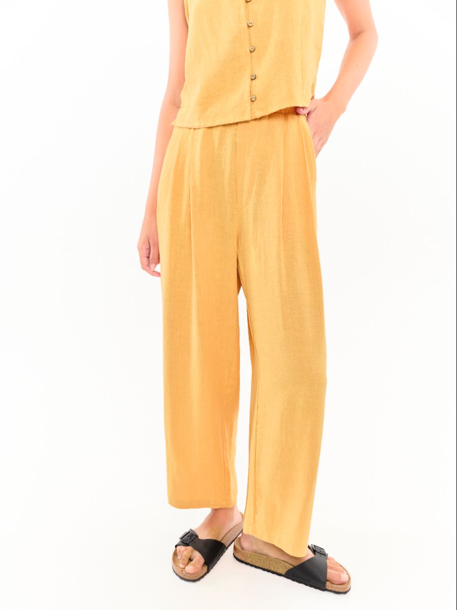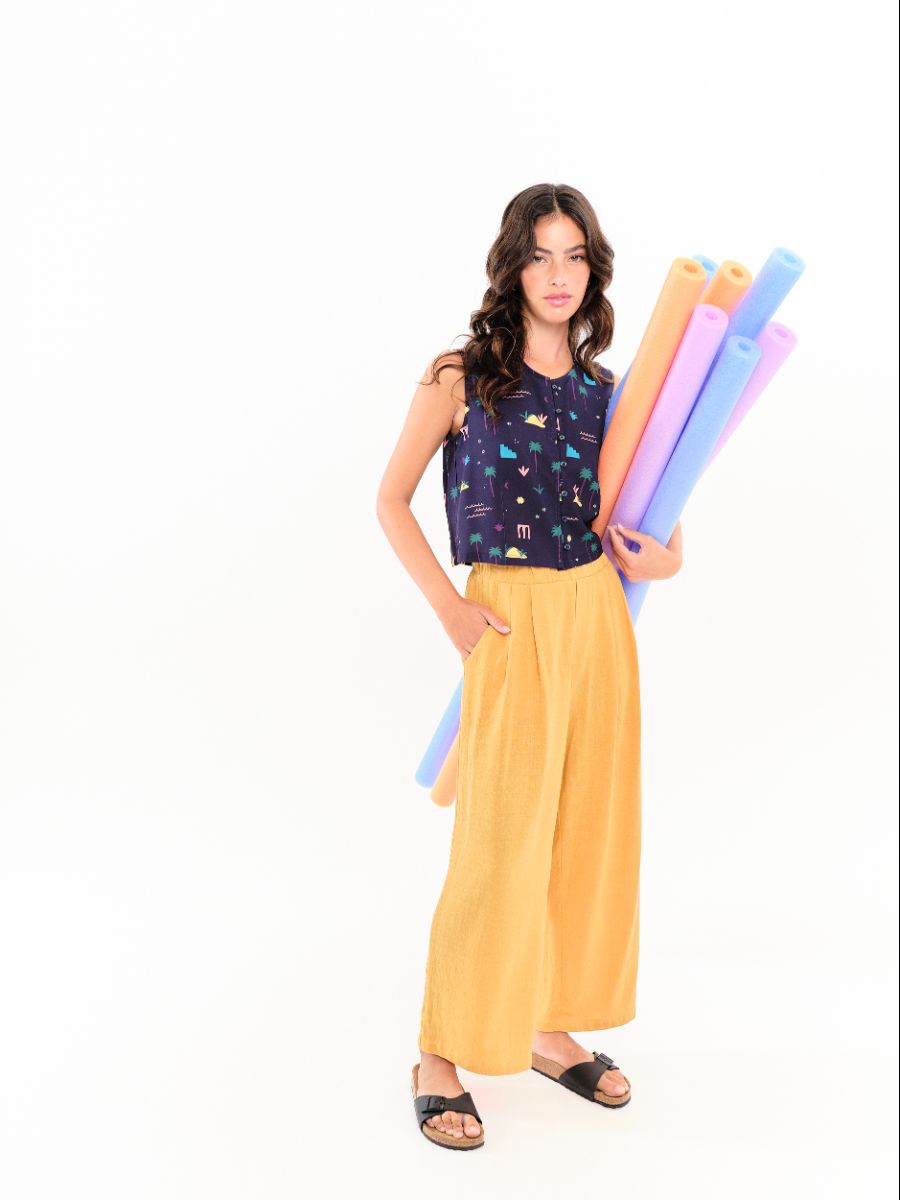 Pantalón de pernera amplia y fluida con pinzas frontales. Cinturilla elástica. Incluye bolsillos laterales. La modelo lleva la talla S.