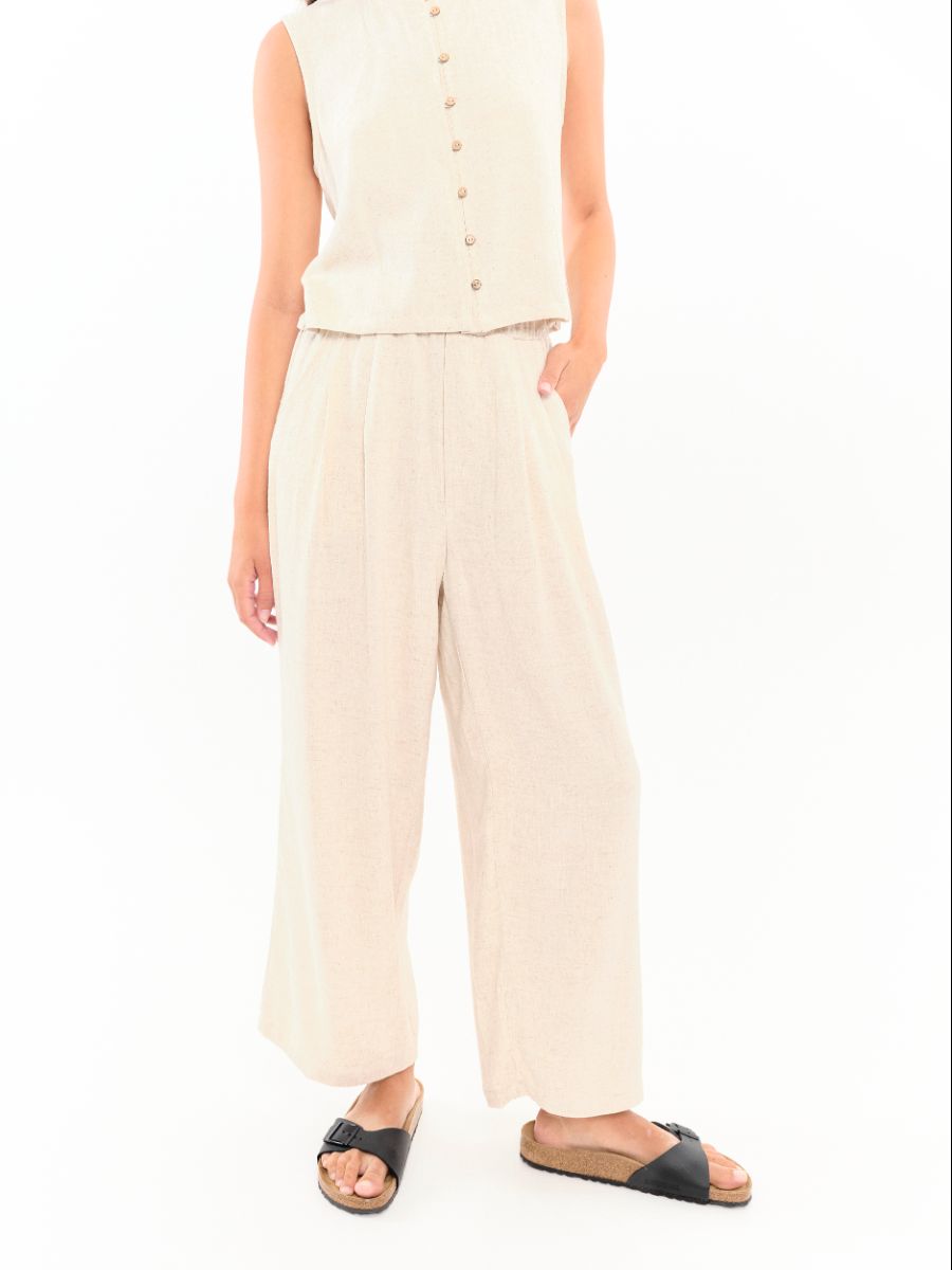 Pantalón de pernera amplia y fluida con pinzas frontales. Cinturilla elástica. Incluye bolsillos laterales. La modelo lleva la talla S.
