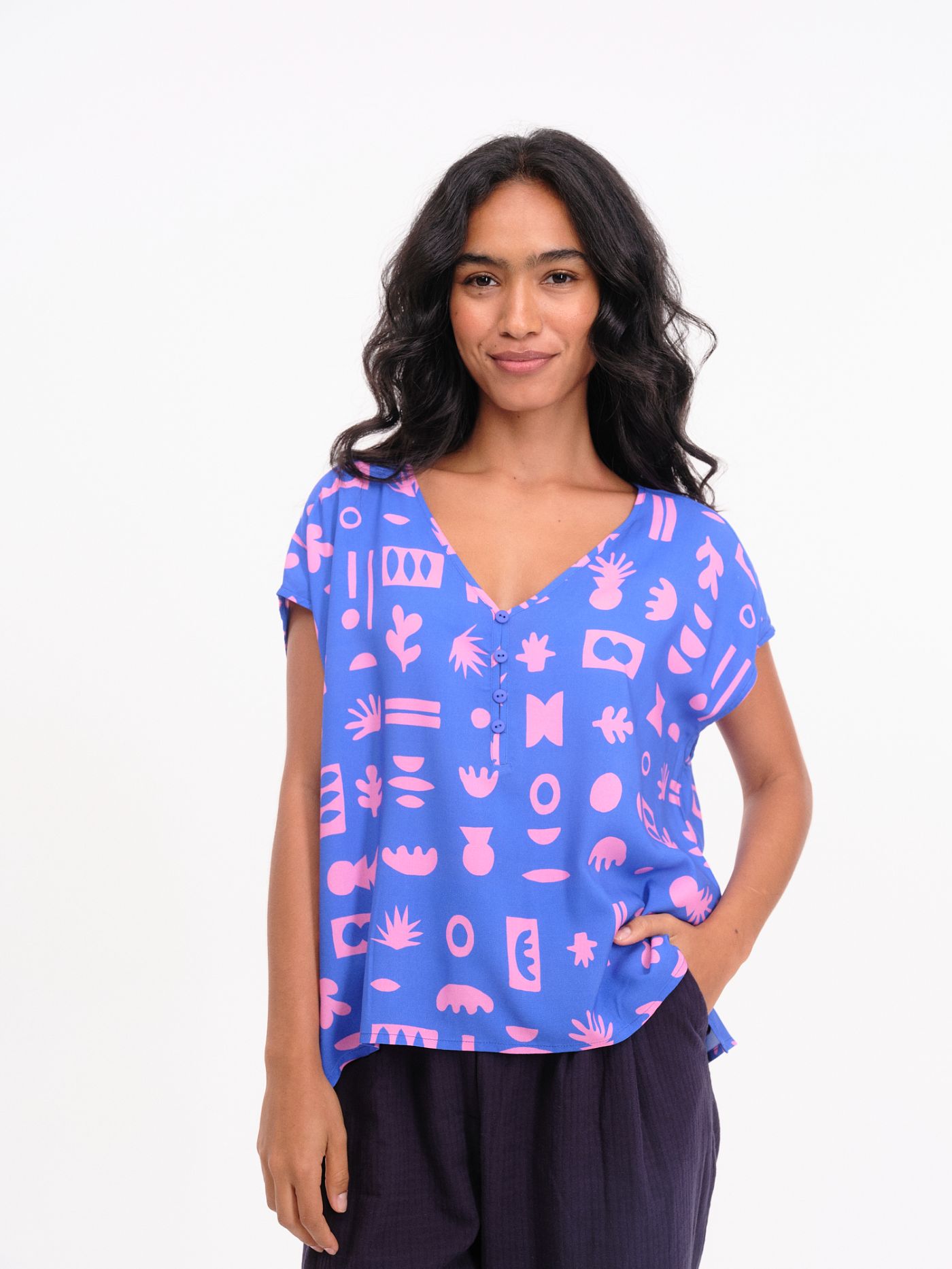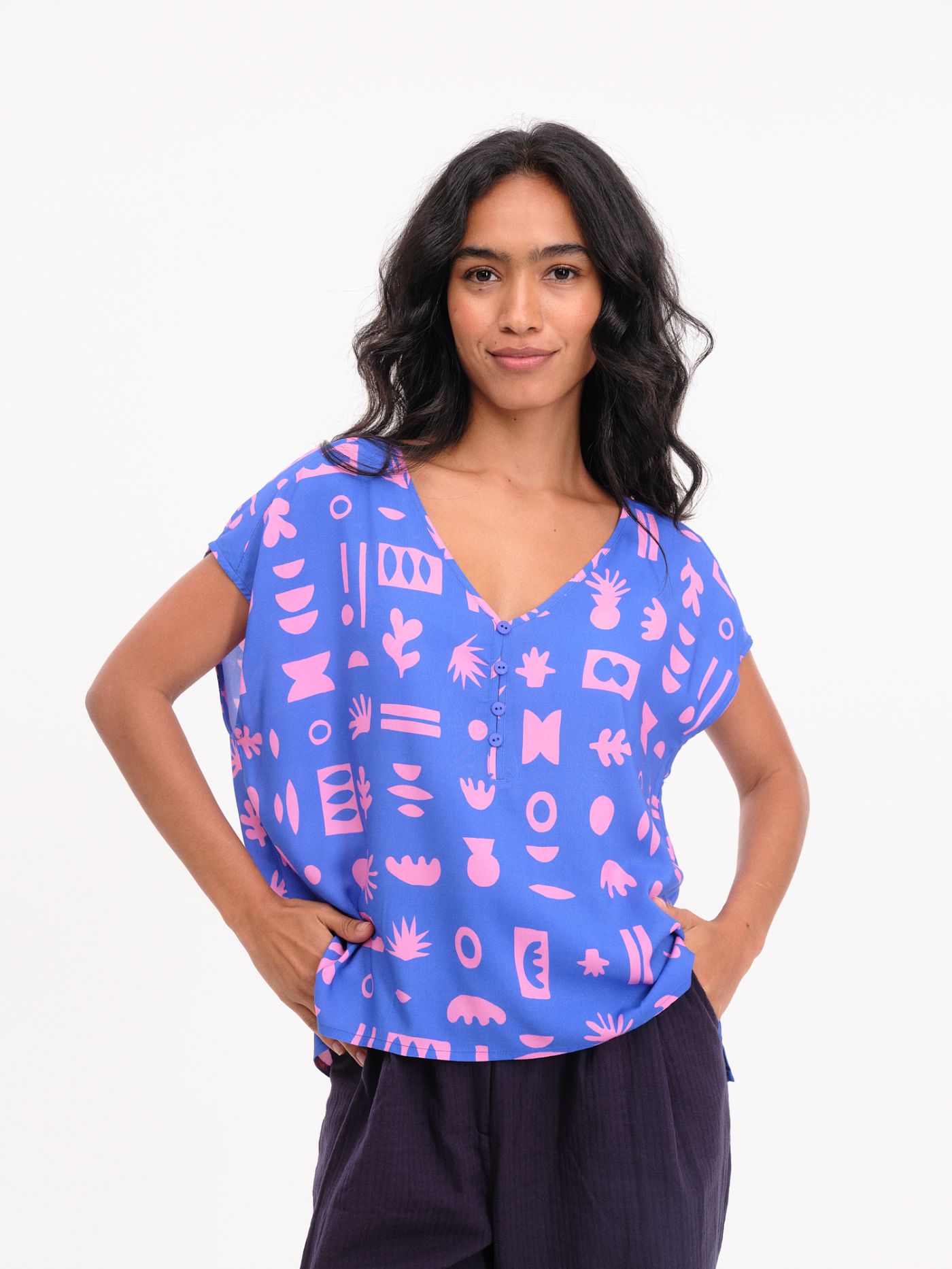 El Top Esva Azul es una prenda que combina sencillez, elegancia y frescura en un diseño versátil y actual. Confeccionado en 100% viscosa, este top ofrece una textura suave, ligera y fluida que garantiza comodidad durante todo el día. Su escote en forma de V realza el cuello y el rostro, mientras que los botones decorativos añaden un toque sutil de estilo. La manga caída aporta un aire relajado que equilibra el diseño, haciendo de esta blusa una pieza imprescindible para el día a día.
