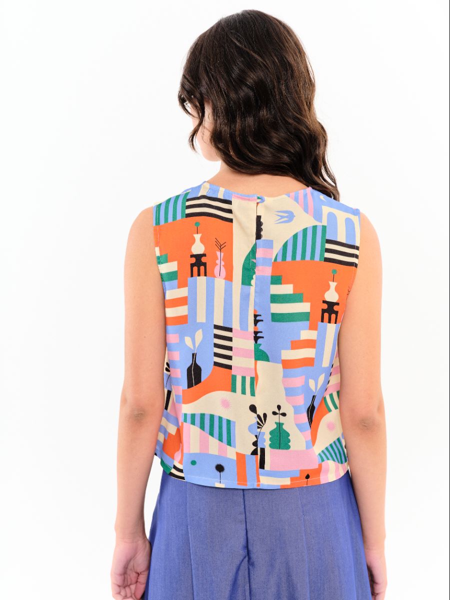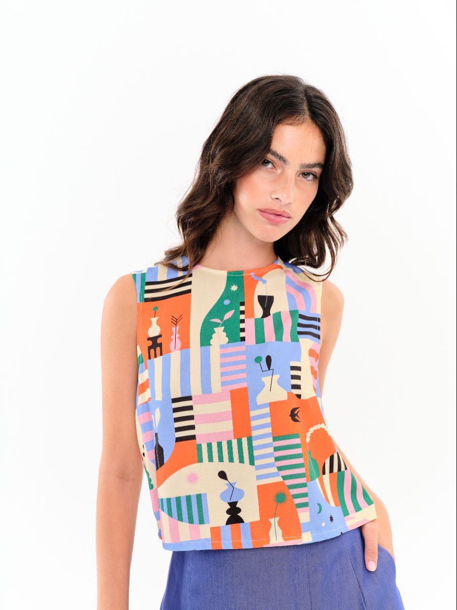 Top sin mangas de corte recto confeccionado en tejido ligero con estampado gráfico multicolor. Diseño limpio y contemporáneo. Ideal para combinar con prendas lisas .La modelo lleva la talla S