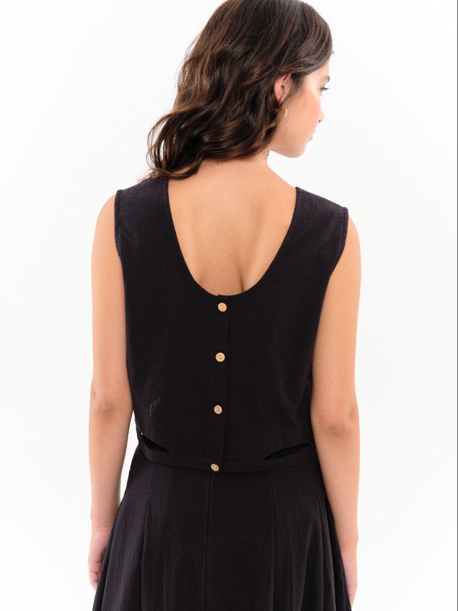Top de algodón con cut outs en forma de onda. Espalda escotada con botones. La modelo lleva una S.