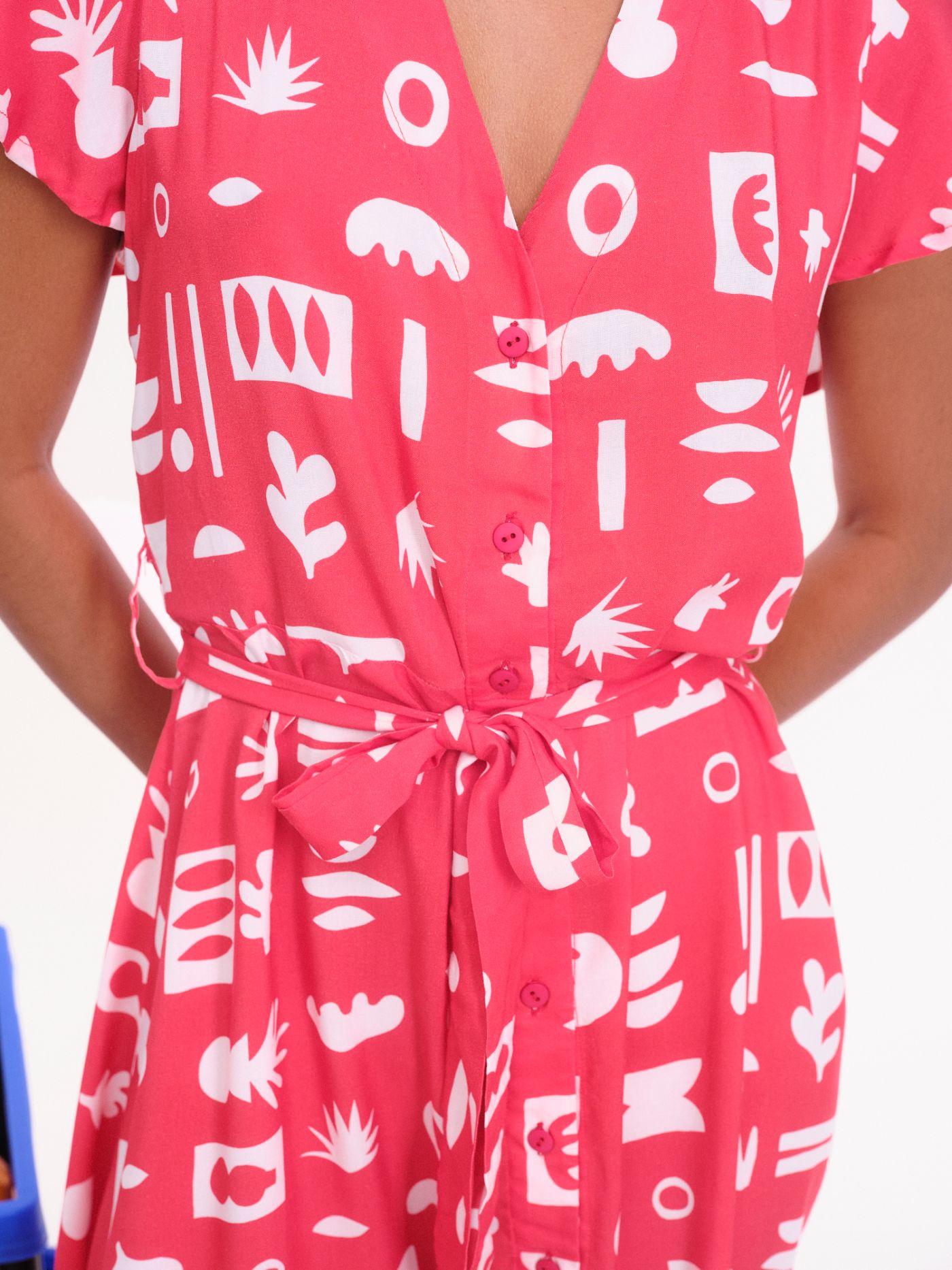 Vestido camisero con escote de pico y mangas acampanadas. Lleva un cinturón para ajustar la cintura al gusto. La modelo lleva una talla S