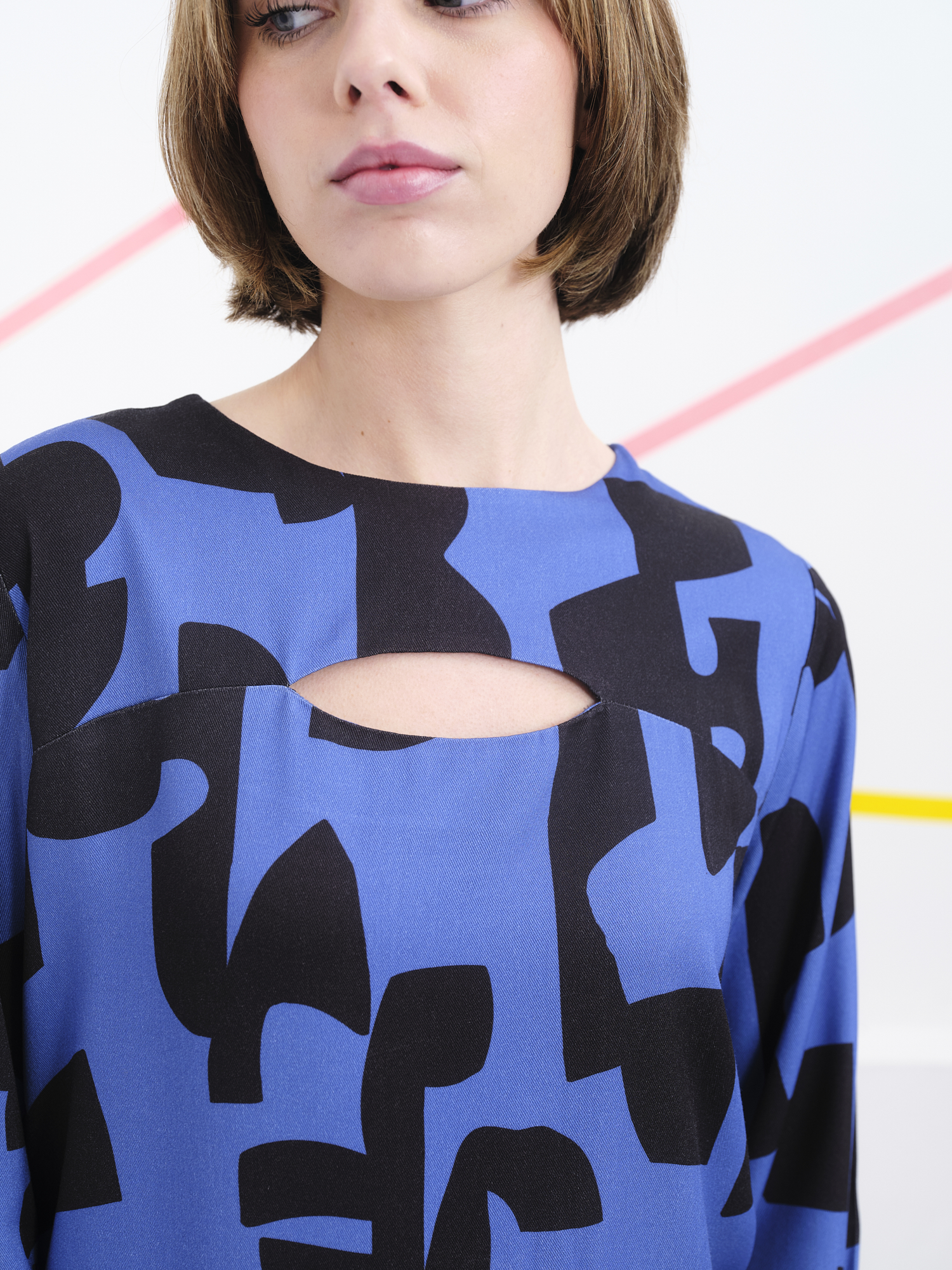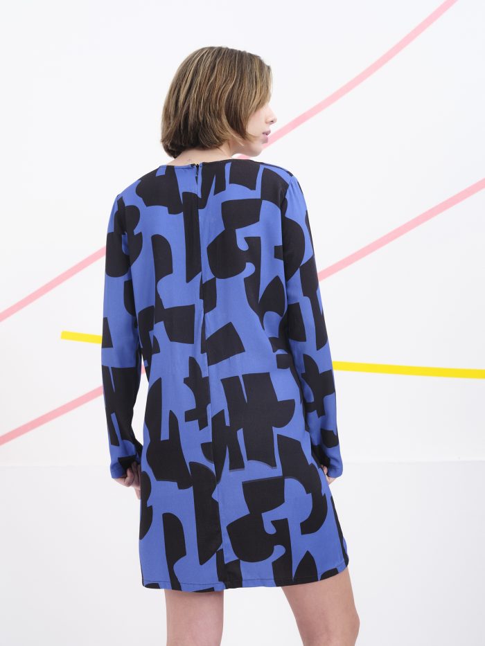 Este vestido corto de manga larga es una pieza gráfica y contemporánea que combina estructura con expresión visual. Confeccionado en un vibrante tono verde, se adorna con un estampado negro de formas abstractas que aportan dinamismo y personalidad. El diseño incluye un cut-out rectangular en el escote, que rompe con la silueta clásica y añade un toque audaz y moderno. Su largo mini y corte recto permiten libertad de movimiento, mientras que el tejido ligero lo convierte en una opción versátil para el día o la noche. Una prenda pensada para quienes buscan vestir con identidad, fuerza y sensibilidad artística.