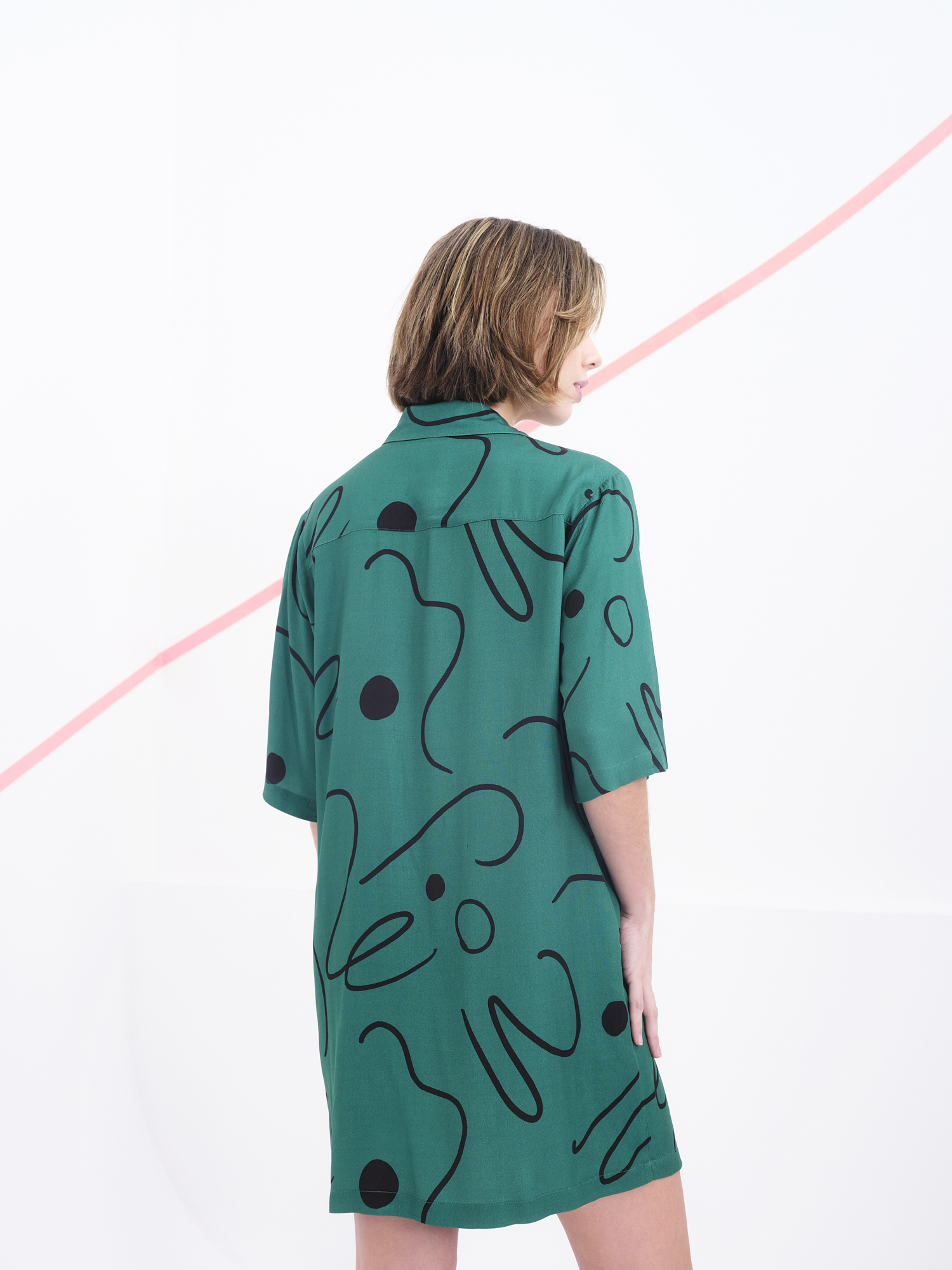 Este vestido camisero de manga corta es una declaración de estilo gráfico y contemporáneo. Confeccionado en una viscosa, se adorna con un estampado de trazos artísticos y espontáneos. Su corte recto y relajado, junto con el cierre frontal de botones, lo convierte en una prenda versátil y cómoda, ideal para llevar tanto en looks informales como en propuestas más creativas.Las mangas caen justo por encima del codo, aportando equilibrio al diseño, mientras que el tejido ligero permite libertad de movimiento. Una pieza pensada para quienes buscan vestir con personalidad y originalidad sin renunciar a la funcionalidad.