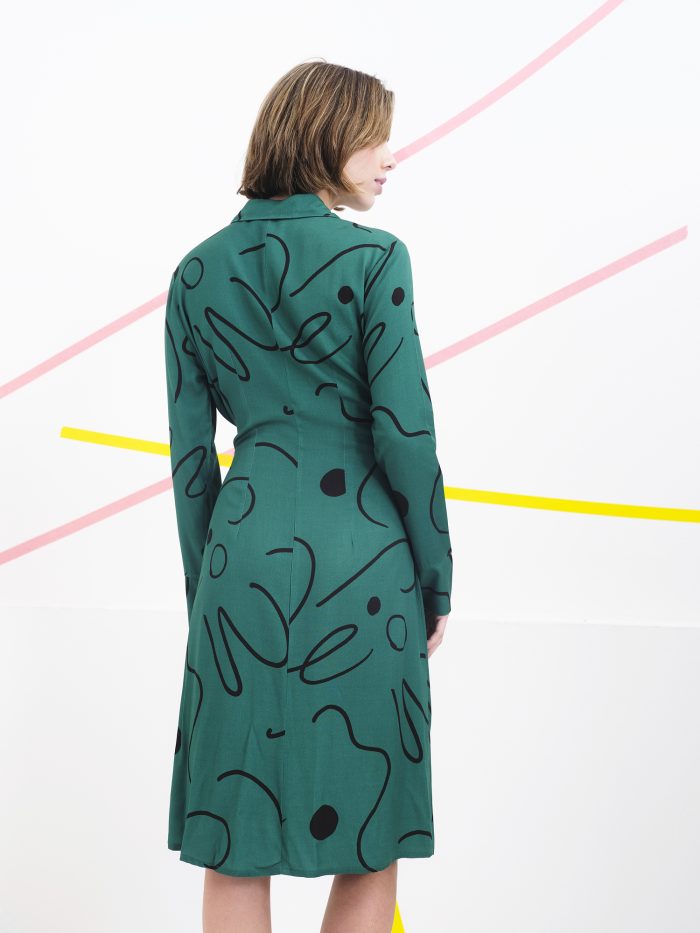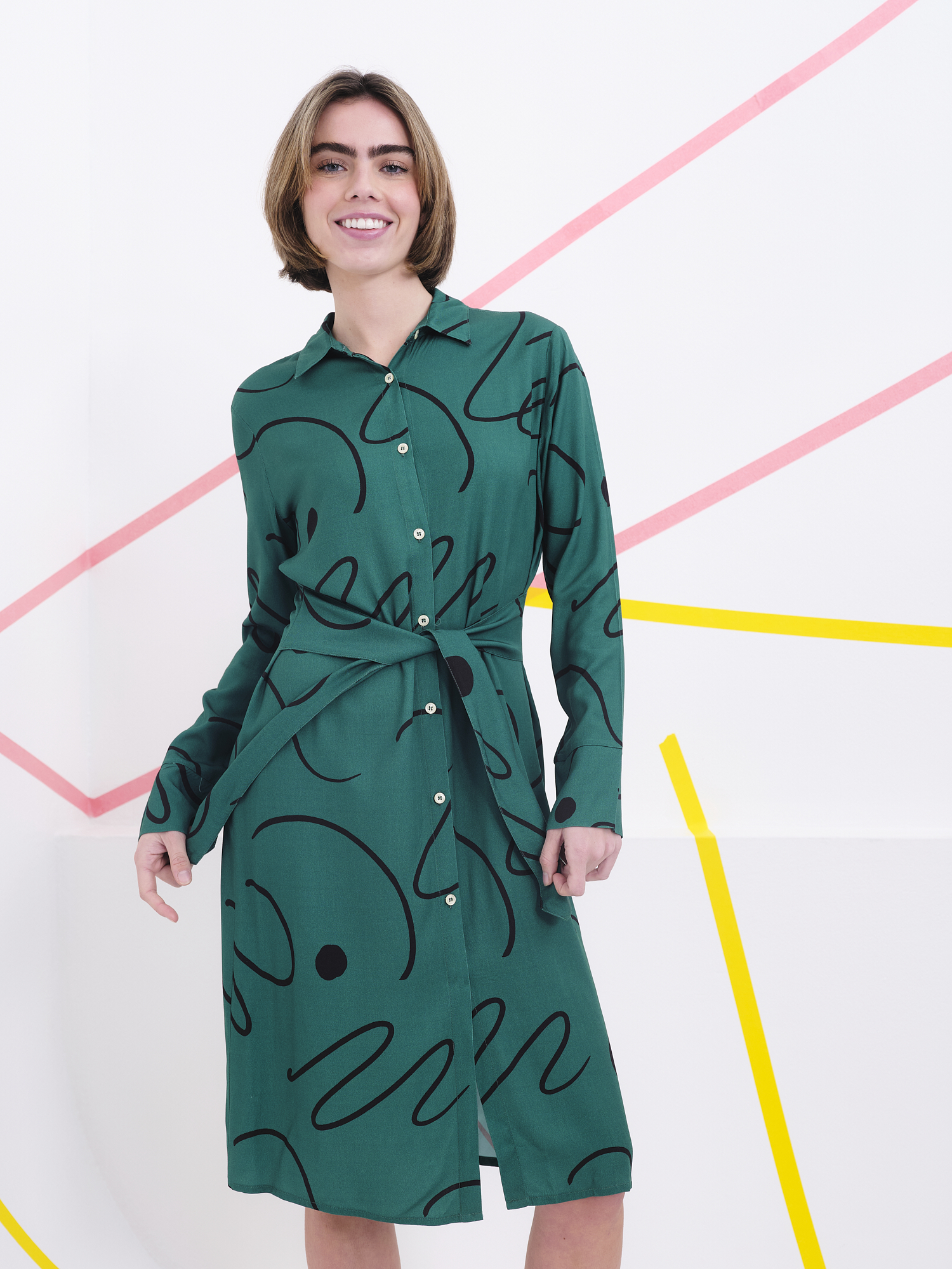 Vestido de manga larga con estampado gráfico en contraste . Su diseño midi con caída fluida aporta movimiento y frescura, mientras que el cuello camisero y la silueta ligeramente entallada le confieren un aire moderno y elegante. Una prenda versátil que combina color y personalidad, ideal para destacar en cualquier ocasión