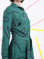 - Estampado gráfico lineal en contraste sobre fondo verde, con estilo contemporáneo.
